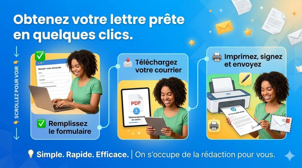 2- Commandez votre document personnalisé : Nous rédigeons une lettre claire, adaptée à votre situation, et conforme aux réglementations.